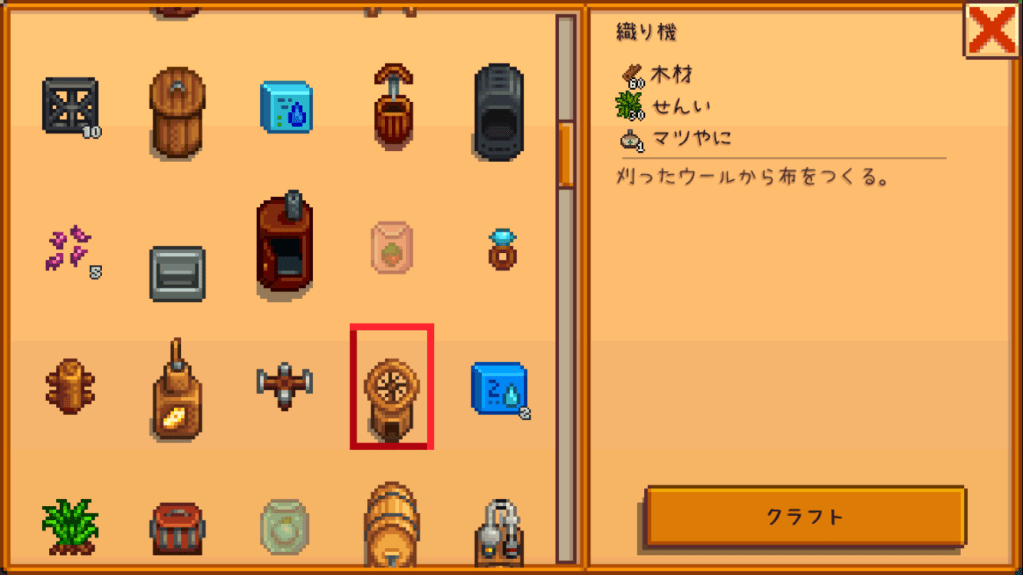 動物小屋をアップグレードし、ヒツジ(または鳥小屋をアップグレードしてウサギ)を飼って、ウールを採取。織り機をクラフトして加工する。