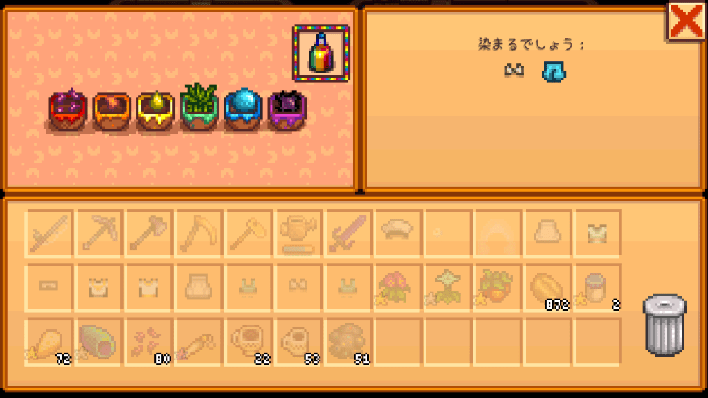 全アイテムを染色桶に入れると、虹色アイコンが出て、カラーバーで好きな色に染められる。