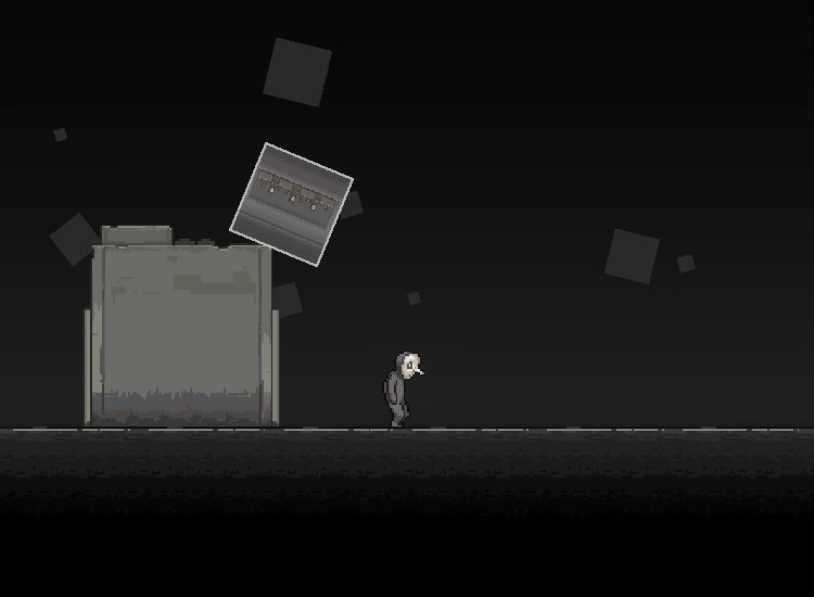 一人の仮面が立っているのは、荒廃した世界でお墓があったはずの場所。立派な家の前に、もうそのお墓はない。
