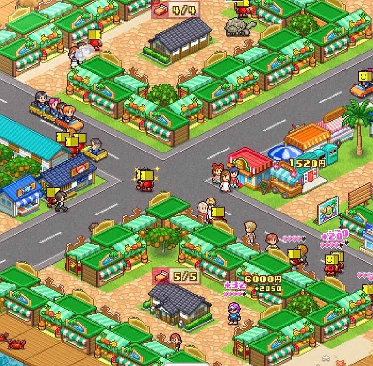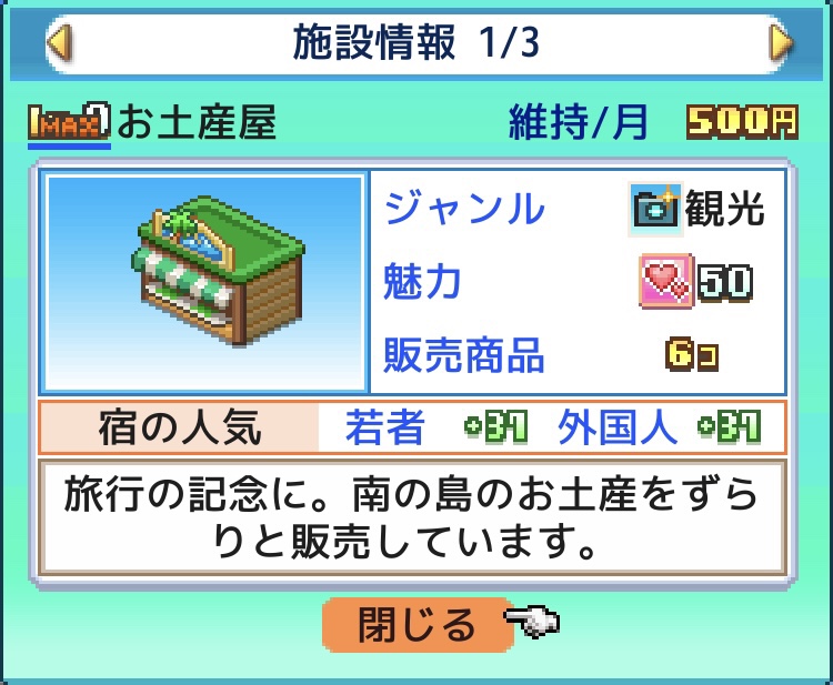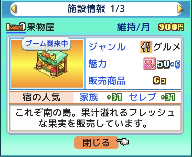 序盤から入手できて設置費用が安く、1マスで、各客層の人気もバランスよく取れる「お土産屋」と「果物屋」を敷き詰めると楽に1位が取れる。(魅力アップの種も使っておくと良い)