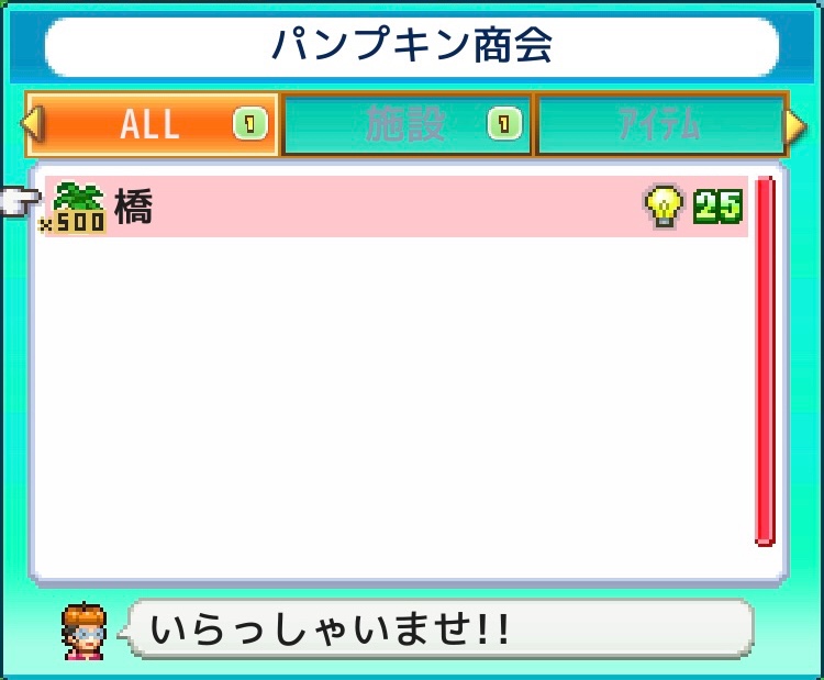 まさかの伏兵「橋」。以降購入ポイントは25から増えないので、全て買い占めるには12500ポイント必要なことになる。