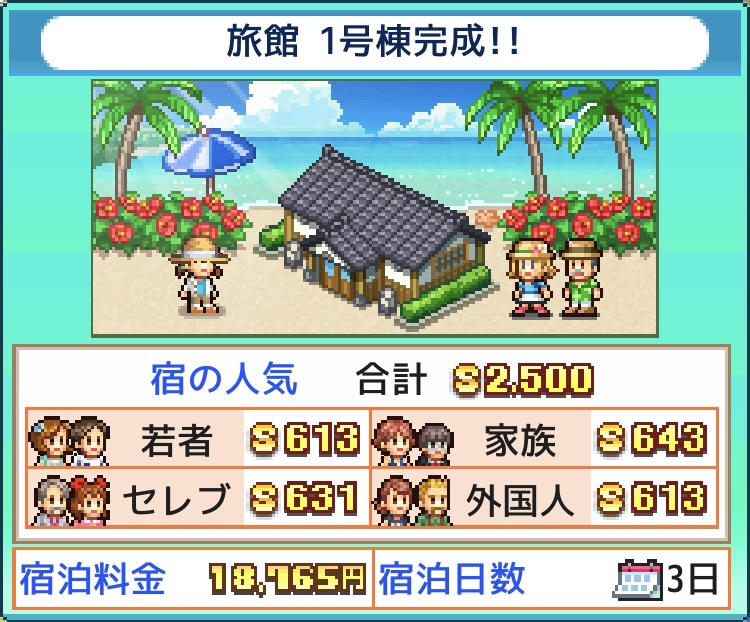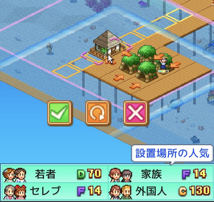 水上コテージなら、海藻(全客層の人気プラス)での底上げも便利。10種類以上設置しておくと、旅行プラン(宿泊日数)も稼げてお得。