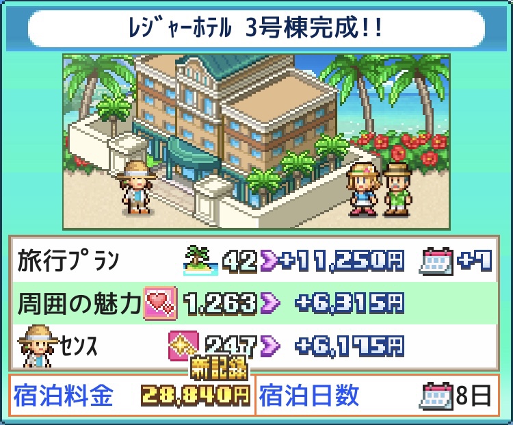 「レジャーに興味」とあるが、ただレジャーが高いよりも旅行プランの多いホテルの方が効果あり。範囲内にレジャー魅力上位3つの施設があればよい。(魅力アップの種で魅力MAXまで上げておく。)