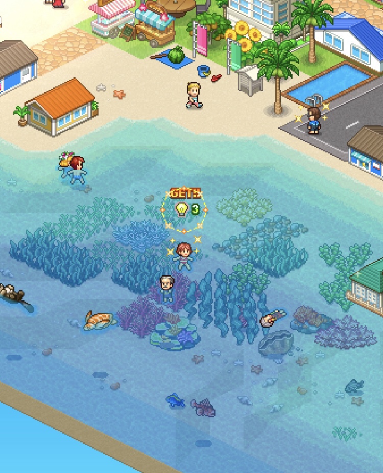 研究ポイントが貯まるタイミングは、「研究熱心」スタッフが陸地で散歩している時と、お客が海で泳いでいる時。