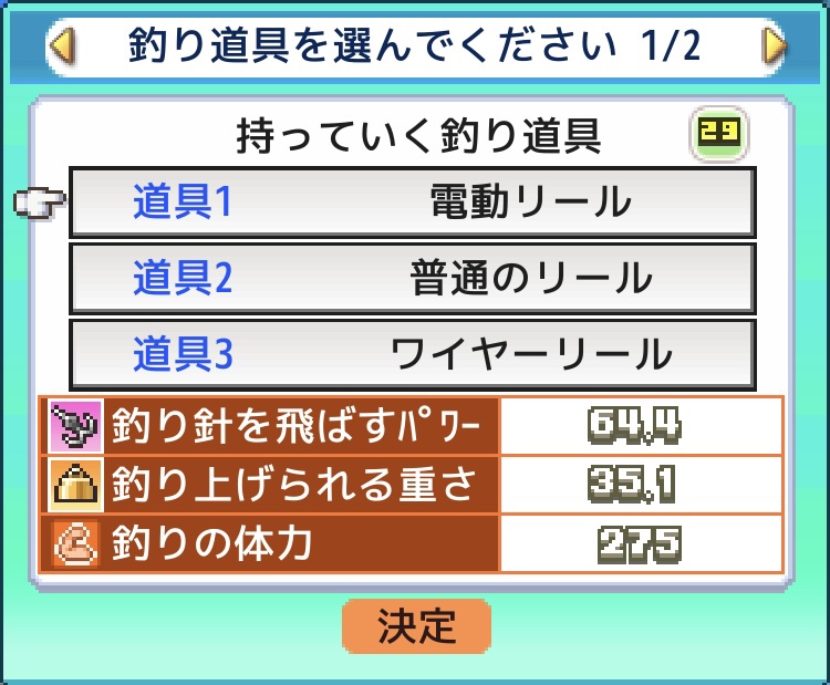 お魚メダルは釣りで簡単に集まる。できるだけパワーは小さく、重さと体力を上げておくのがコツ。