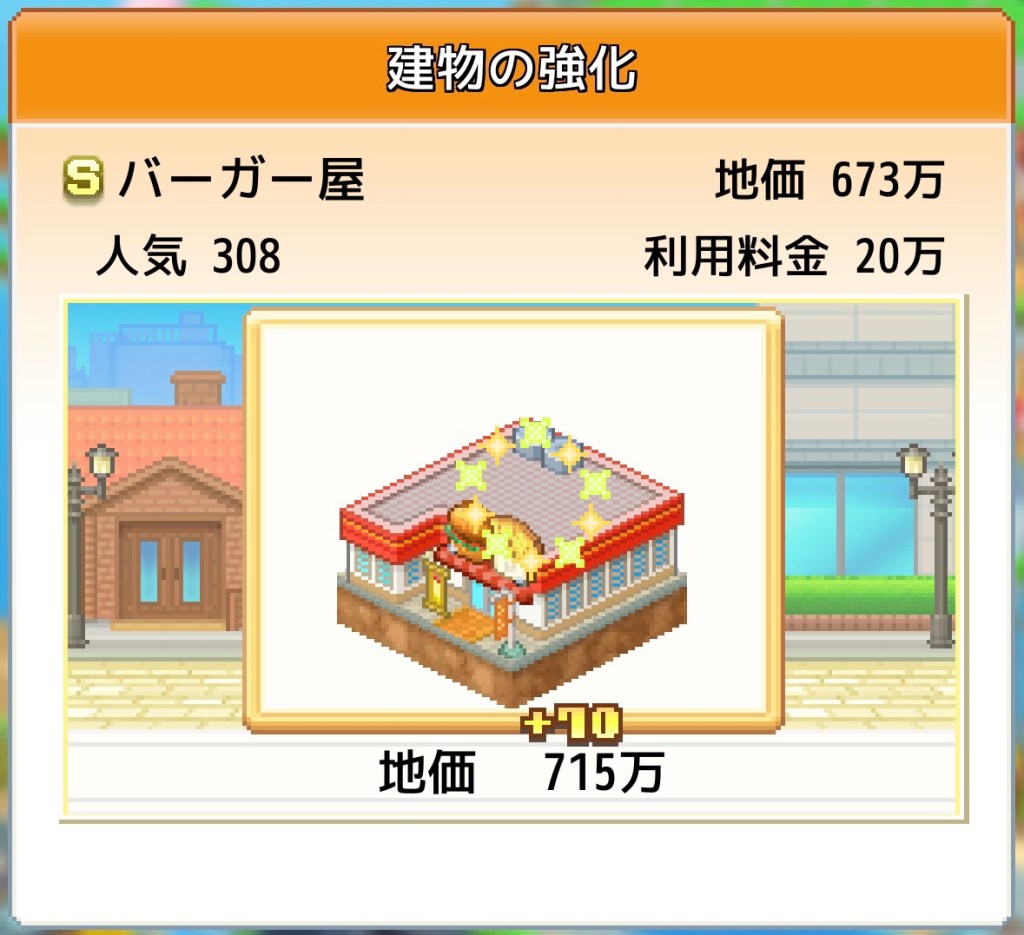 バーガー屋をアイテムで全力強化して資金と土地の限り敷き詰めれば、地価が爆上がりしてスコアが上がる。