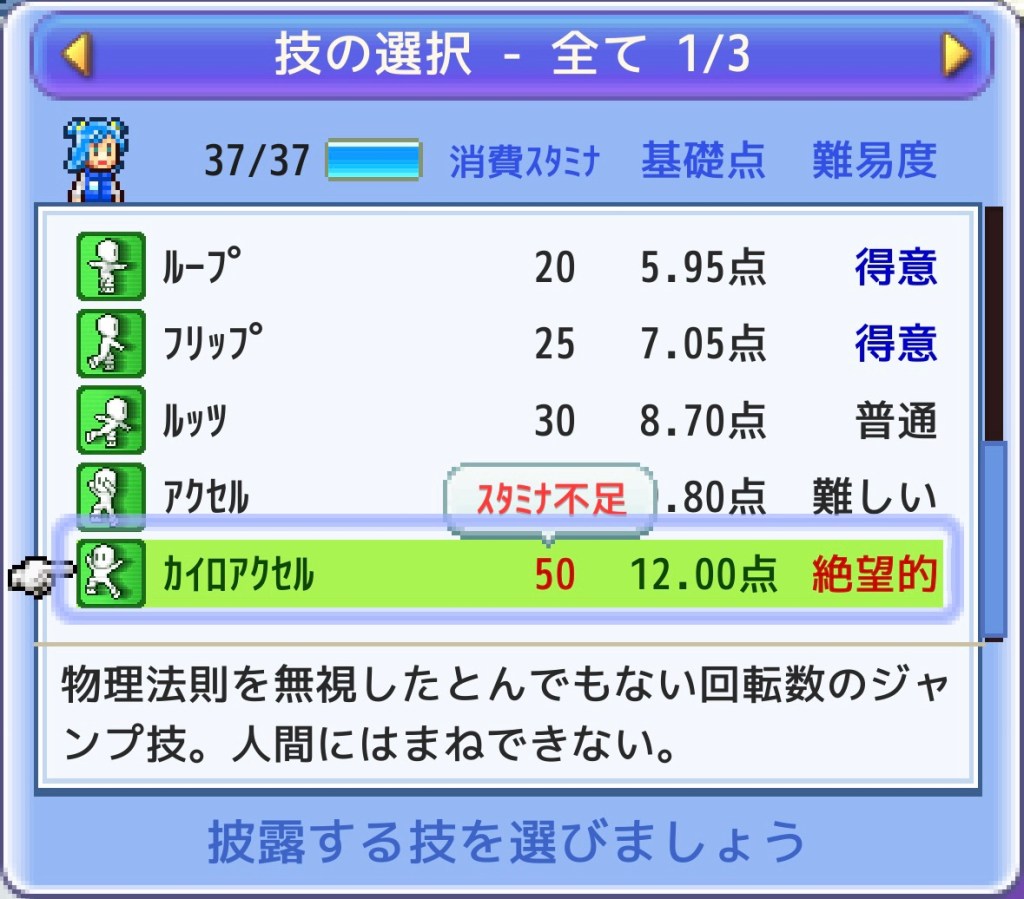 一ランク下の「ドリンコ・ユウコ」まではスタミナ不足によりカイロアクセルが跳べず断念。「気合ガッツ」はカイロアクセルは何とか跳べるものの、成功率が低くなかなか点数が出ない。