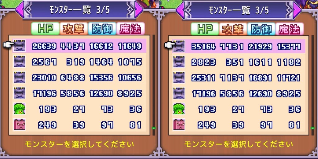 本当のステータス上昇値を確認したければ、最初にモンスターを撤去してから合体すると良い。